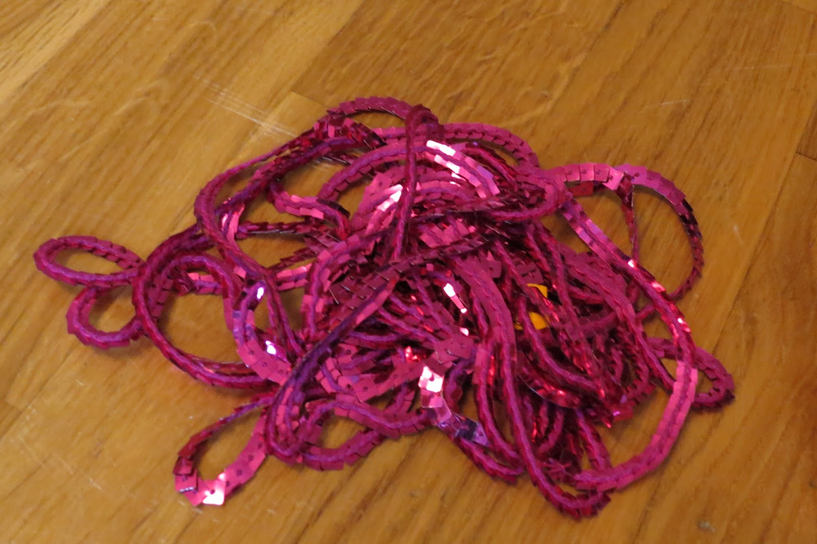 Paljettinauha löyty alekorista. Sille jäi hintaa muistaakseni 0,20€/m. :) Aika edullista minusta. Muuten alekori olikin aika tyhjä. Viime kesänä tuosta samaisesta alekorista ostin aika paljon puuvillapitsejä 0,50-0,70€/m. Mutta nyt ei ollut yhtään pitsejä siinä. :(